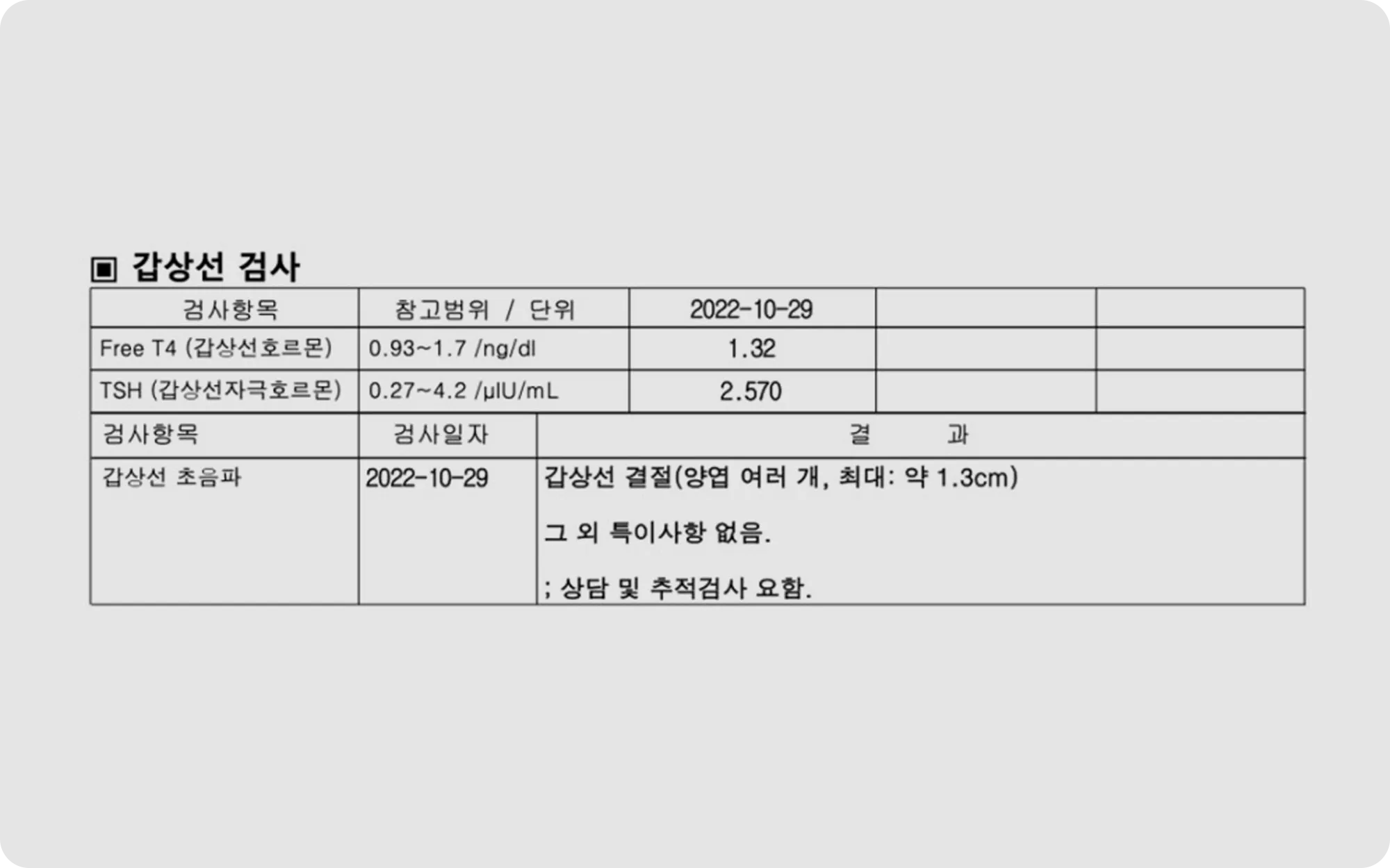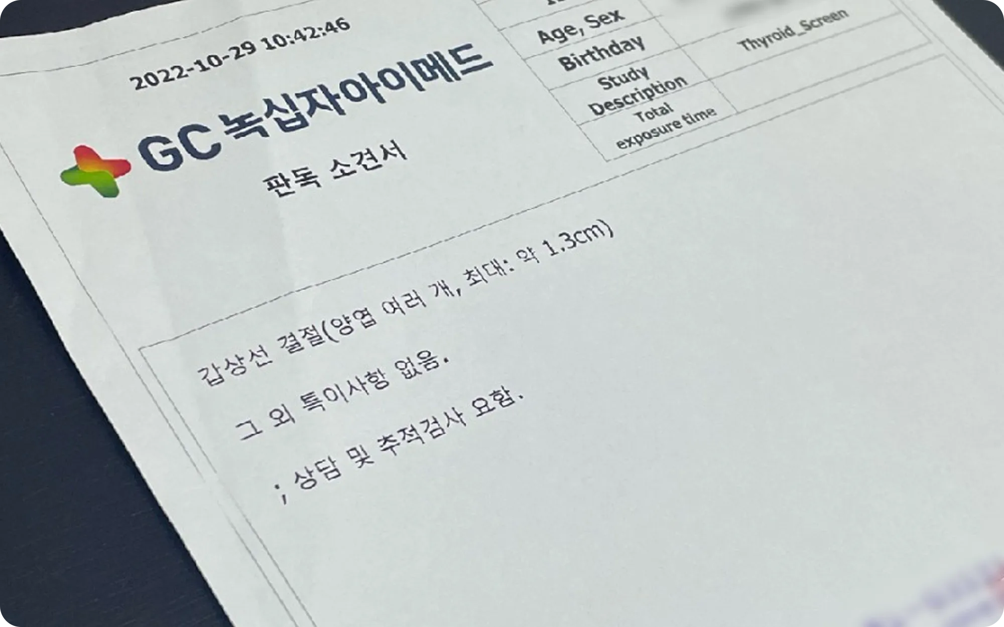일단 당시 다니고 있던 회사는 연봉도 과분했지만, 특히 복지로 비싼 전신 건강검진을 지원해주었기에 바로 건강검진을 실시했다. 2030에 속하는 나이였기 때문에 큰 걱정을 하지 않고 있었지만 내 갑상선과 이별은 이게 시작이었다...!